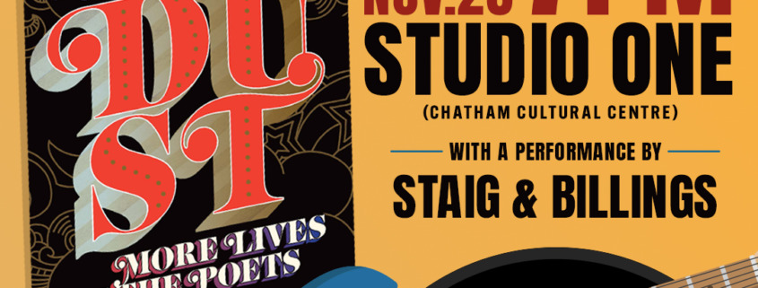 Join us in Chatham for the launch of Ray Robertson’s Dust: More Lives of the Poets (with Guitars)! Ray will be reading from his new book, followed by a performance from Toronto-based musical duo Staig and Billings. Books will be available for sale and signing.